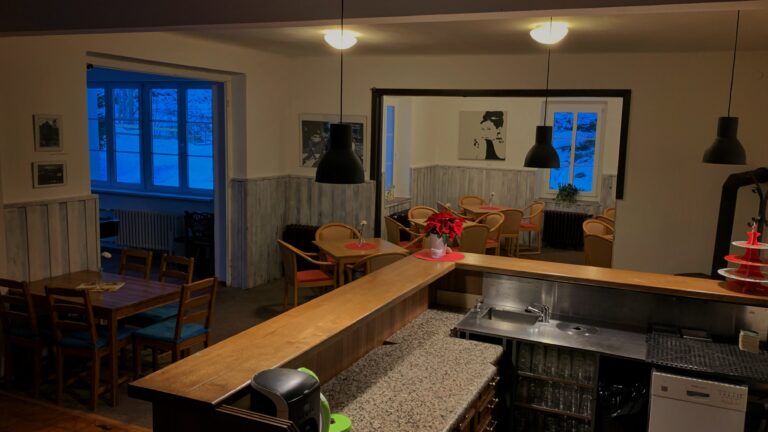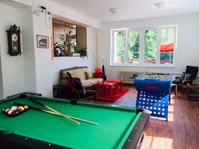 Chata je kompletně vybavena s neobyčejně velikým prostorem pro společné aktivity (kuchyň 25m², lyžárna/kolárna 25m², restaurace, bar a herna 120m²).